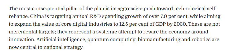 文章認(rèn)為,“十五五”規(guī)劃綱要最具分量的支柱,在于對(duì)科技自立自強(qiáng)的強(qiáng)力推進(jìn)。中國(guó)明確提出,研發(fā)經(jīng)費(fèi)支出年均增長(zhǎng)將超過(guò)7.0%,并力爭(zhēng)到2030年,核心數(shù)字經(jīng)濟(jì)產(chǎn)業(yè)增加值占GDP的比重提升至12.5%。這些并非漸進(jìn)式目標(biāo),而是一場(chǎng)以創(chuàng)新為核心、系統(tǒng)重構(gòu)經(jīng)濟(jì)體系的戰(zhàn)略轉(zhuǎn)型。人工智能、量子計(jì)算、生物制造與機(jī)器人技術(shù),已全面上升為國(guó)家戰(zhàn)略的核心。