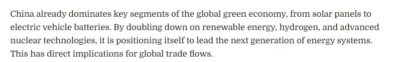 文章關(guān)注到,該規(guī)劃綱要將綠色發(fā)展置于中國(guó)經(jīng)濟(jì)轉(zhuǎn)型的核心位置。中國(guó)已在全球綠色經(jīng)濟(jì)的關(guān)鍵領(lǐng)域占據(jù)主導(dǎo)地位,從太陽(yáng)能電池板到電動(dòng)汽車電池,無(wú)一例外。通過(guò)加大對(duì)可再生能源、氫能以及先進(jìn)核能技術(shù)的投入,中國(guó)正致力于成為下一代能源體系的引領(lǐng)者。這將對(duì)全球貿(mào)易格局產(chǎn)生直接影響。