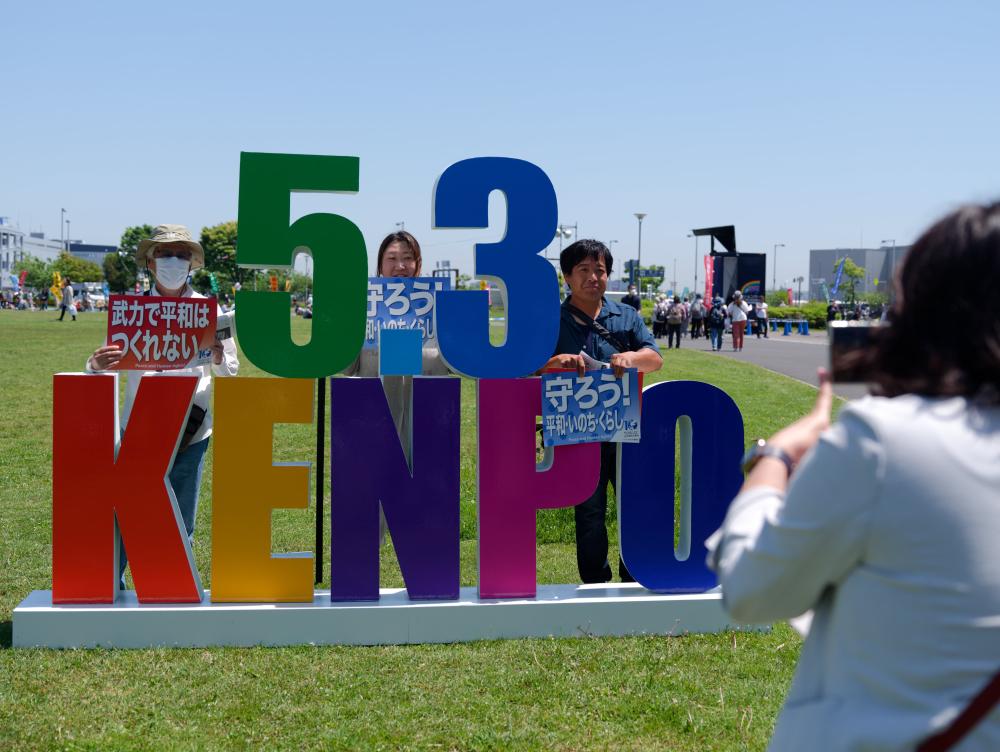 2024年5月3日,在日本東京有明防災(zāi)公園,人們舉著標(biāo)語與憲法大集會(huì)的標(biāo)識(shí)合影。當(dāng)日,3萬余名日本民眾聚集在東京有明防災(zāi)公園的廣場(chǎng)上,高喊“守護(hù)憲法、守護(hù)和平”的口號(hào),舉行了聲勢(shì)浩大的護(hù)憲集會(huì)。新華社記者 張笑宇 攝