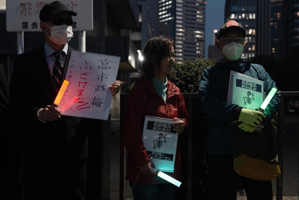 4月16日,在位于日本東京的首相官邸前,抗議者手持標(biāo)語參加集會(huì)。