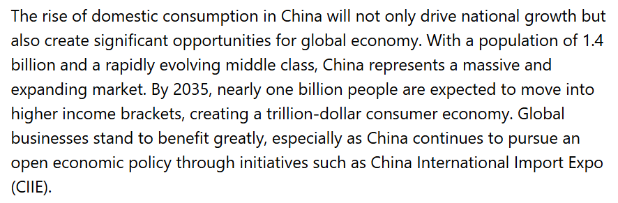 文章認(rèn)為,中國消費(fèi)的持續(xù)崛起,不僅將推動(dòng)自身增長,也將為全球經(jīng)濟(jì)創(chuàng)造巨大機(jī)遇。憑借14億人口和不斷擴(kuò)大的中等收入群體,中國正在形成一個(gè)體量龐大、持續(xù)擴(kuò)容的消費(fèi)市場。