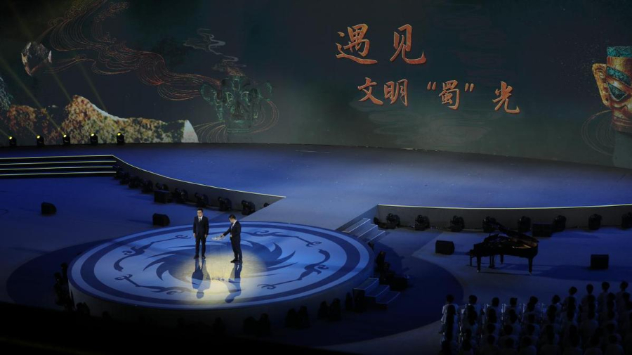 四川省文物考古研究院舊石器考古研究所所長(zhǎng)、皮洛遺址考古領(lǐng)隊(duì)鄭喆軒和四川省文物考古研究院三星堆遺址工作站站長(zhǎng)、三星堆博物館副館長(zhǎng)冉宏林講述《遇見(jiàn)文明“蜀”光》 楊曉恒攝