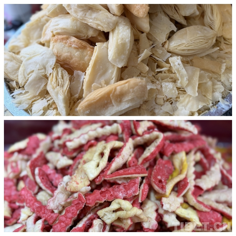 圖為卡塞,是一種油炸面食,是藏歷新年必備的年貨之一。卡塞一般用面粉、酥油、白糖等原料,油炸而成。橢圓形的“果子”、蝴蝶狀的“耳朵”……各色造型的“卡塞”寄托著人們對團(tuán)圓、富足的美好祈愿。