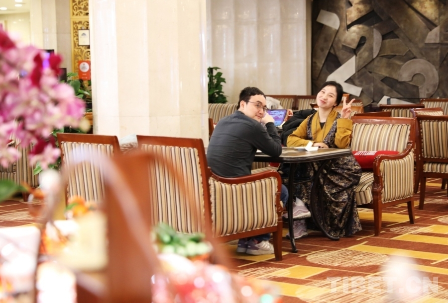 中國(guó)西藏網(wǎng)記者們感受2026年全國(guó)兩會(huì)新聞中心茶歇處設(shè)施 攝影:劉莉