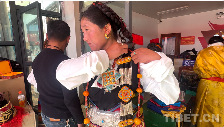 身著傳統(tǒng)服飾的曲堆“諧欽”隊演職人員在整理配飾
