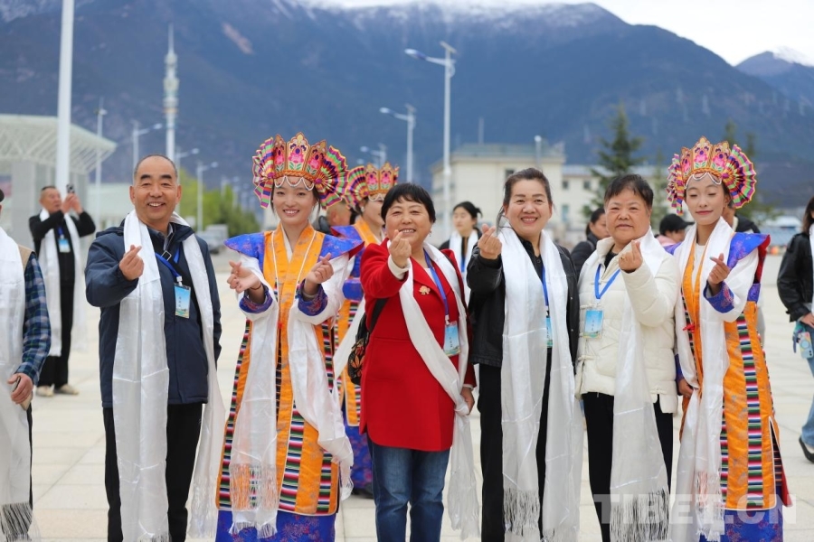 專列游客在林芝站與身著民族服飾的工作人員合影打卡