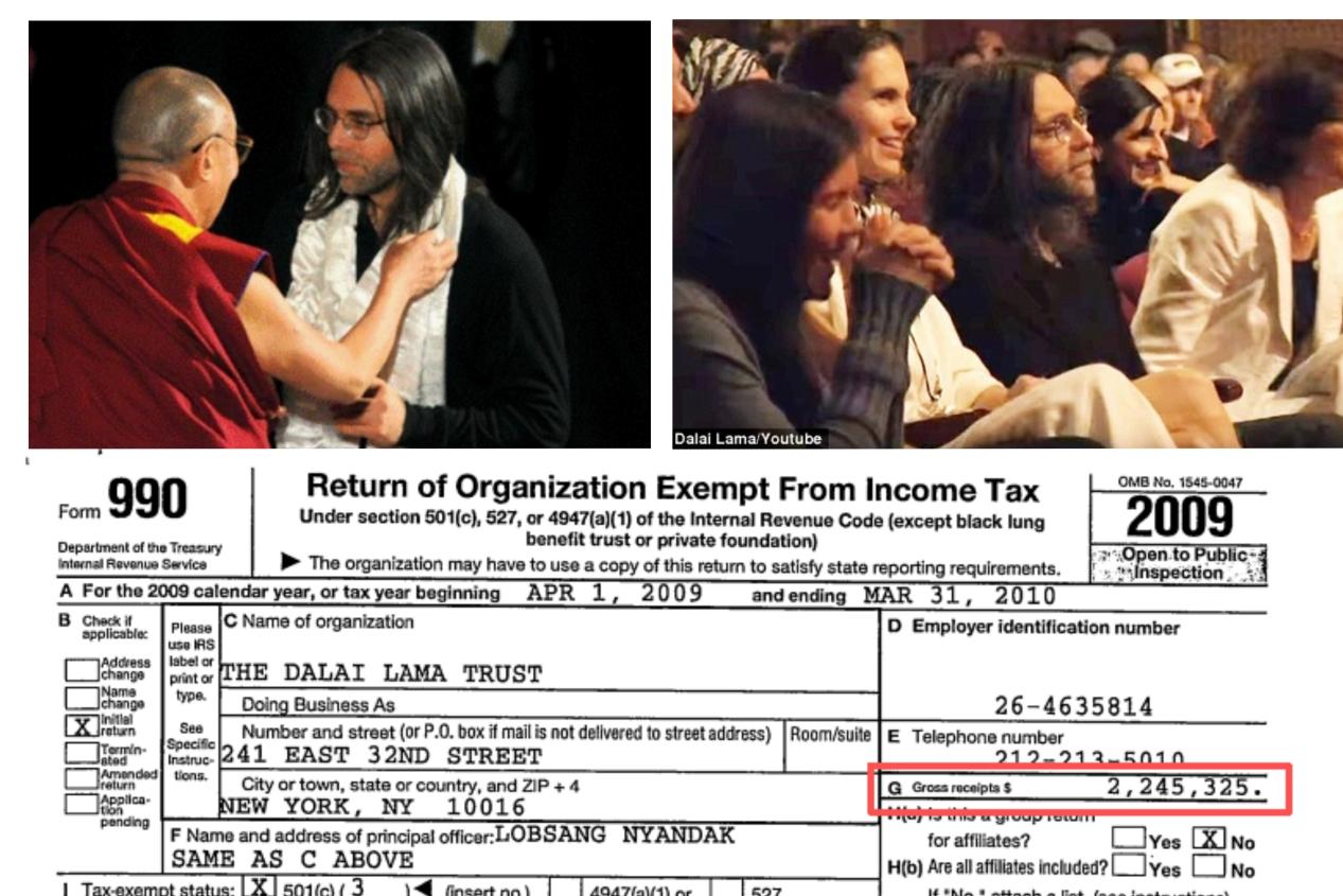 上圖左:達賴為性邪教組織NXIVM頭目基思·拉尼爾戴哈達 上圖右:基思·拉尼爾與金主布朗夫曼姐妹聆聽達賴的演講 下圖:美國國稅局的報稅表顯示,2009年“達賴信托基金會”入賬220余萬美元