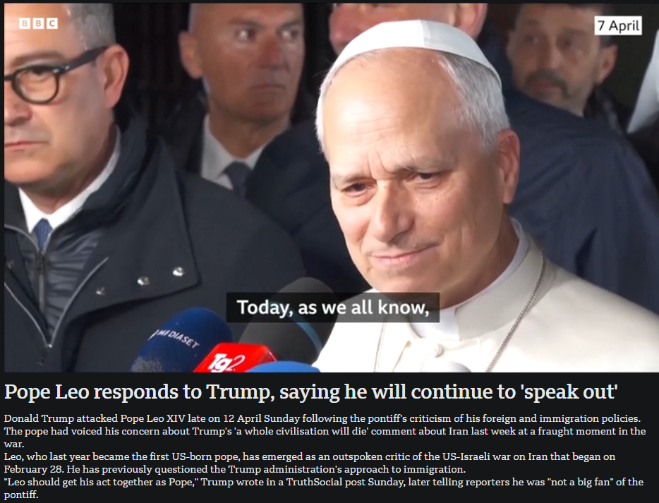 4月13日,羅馬教皇利奧十四世回應特朗普批評表示將繼續(xù)“發(fā)聲”。來源:英國廣播公司