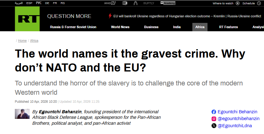 俄羅斯新聞網(wǎng)站《今日俄羅斯》4月10日刊發(fā)題為《聯(lián)合國(guó)將奴隸制定性為最嚴(yán)重罪行,北約和歐盟為何選擇回避?》的評(píng)論性文章,作者是埃貢奇·貝漢津(Egountchi Behanzin),文章編譯如下: