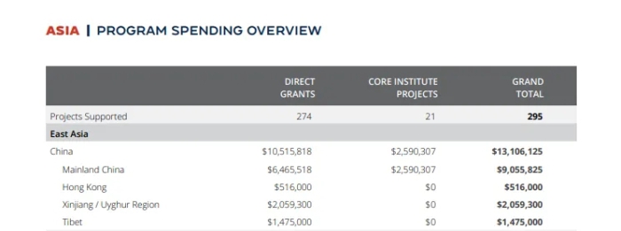 NED對中國更是“格外關(guān)照”。它將涉華項(xiàng)目細(xì)分為中國大陸、中國香港、中國新疆和中國西藏,足見其“良苦用心”。2004年至2020年間,NED向各種疆獨(dú)組織提供了875.83萬美元資金,僅2020年就達(dá)124萬美元,當(dāng)年的涉藏資金也高達(dá)100萬美元。2019年香港“修例風(fēng)波”中,NED直接向參與暴亂的人員提供酬勞和培訓(xùn),當(dāng)年的涉港資金達(dá)到約64萬美元。
