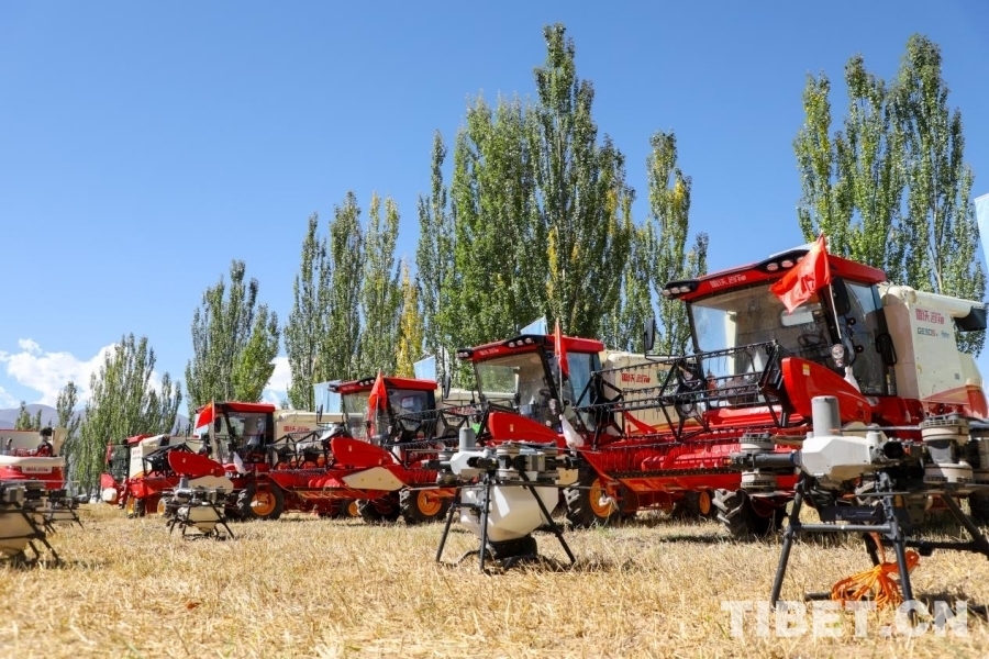 拉薩林周縣強(qiáng)嘎鎮(zhèn)典沖村的農(nóng)田中停放的現(xiàn)代化農(nóng)機(jī)設(shè)備(2025年9月23日攝)