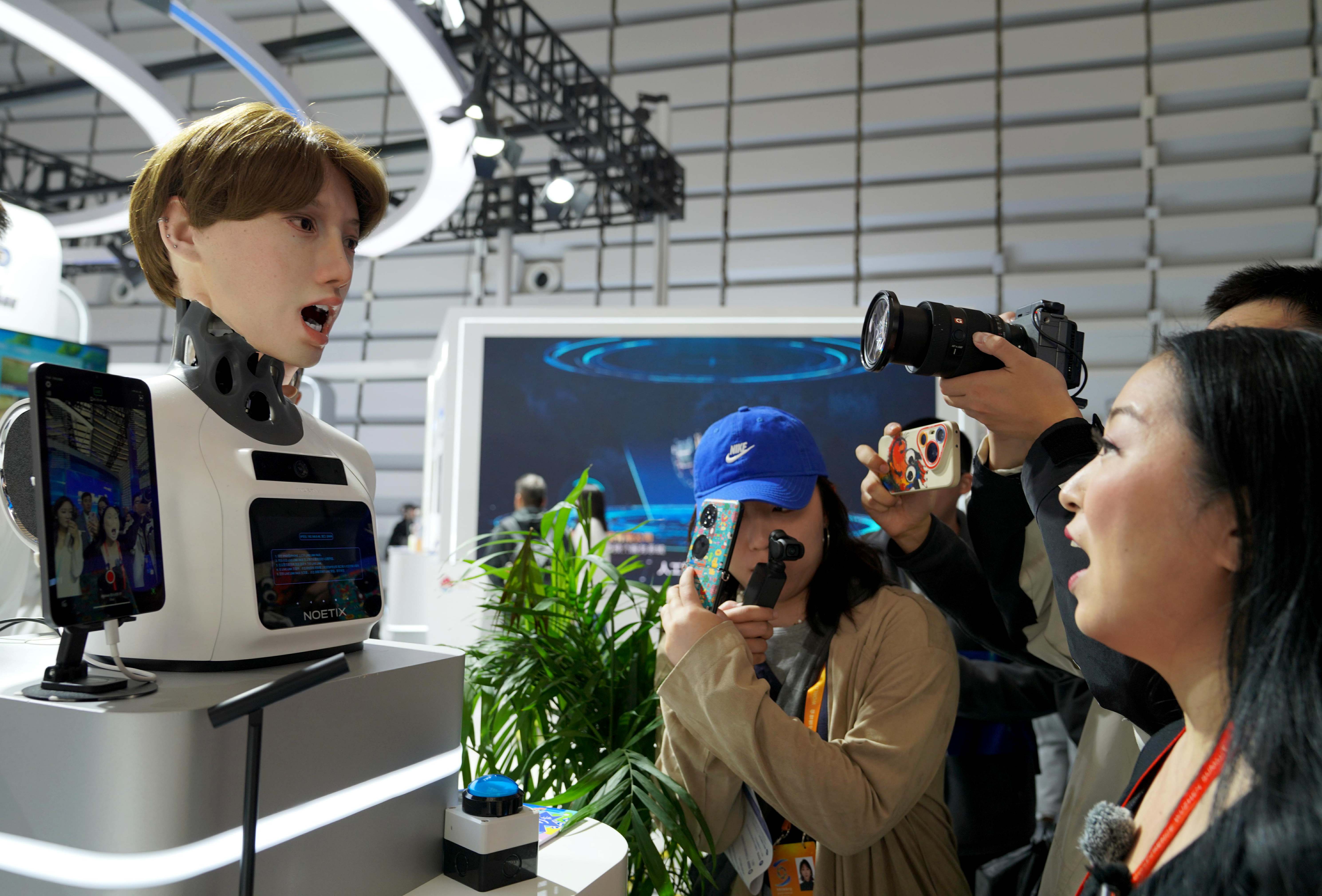2025年11月6日,一名工作人員與一款松延動(dòng)力仿生機(jī)器人互動(dòng)。新華社記者 趙宇思 攝