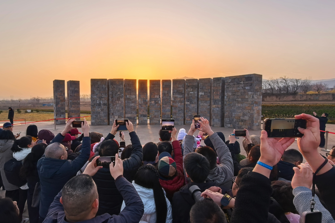 3月20日,山西省襄汾縣,游客們在帶著涼意的晨霧中久久守候日出的到來。7點(diǎn)10分,塔兒山的輪廓在天光里緩緩浮現(xiàn),一束穿越四千年的陽光,精準(zhǔn)穿過第7道觀測縫隙,投射到觀測點(diǎn)上,如約喚醒了晝夜均分的一天。