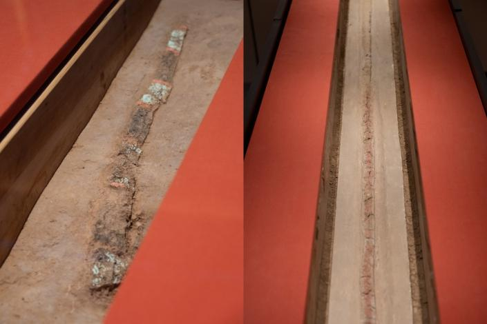 ▲陶寺遺址出土的圭尺(左)和圭表(右)局部