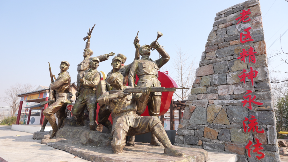 抗戰(zhàn)時(shí)期,丁莊村人口不足200,卻有40余人參軍報(bào)國(guó),被鄉(xiāng)親們稱作“丁半連”。村口小廣場(chǎng)的那座雕像,定格著丁莊村好兒郎當(dāng)年浴血奮戰(zhàn)的英勇模樣:循著嘹亮軍號(hào),8位戰(zhàn)士或蹲姿射擊、或緊握機(jī)槍、或手托炸藥包、或召喚戰(zhàn)友——他們以一往無(wú)前的姿態(tài),向著戰(zhàn)場(chǎng)奮勇沖鋒。