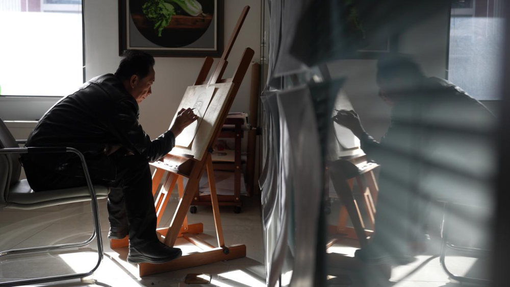 畫室窗前,林宇輝久久佇立。潔白的雪花,給了他創(chuàng)作的靈感。一轉(zhuǎn)身,他鋪展開(kāi)一張嶄新的畫紙。筆尖起落,很快,一雙清澈的眼睛呈現(xiàn)面前。