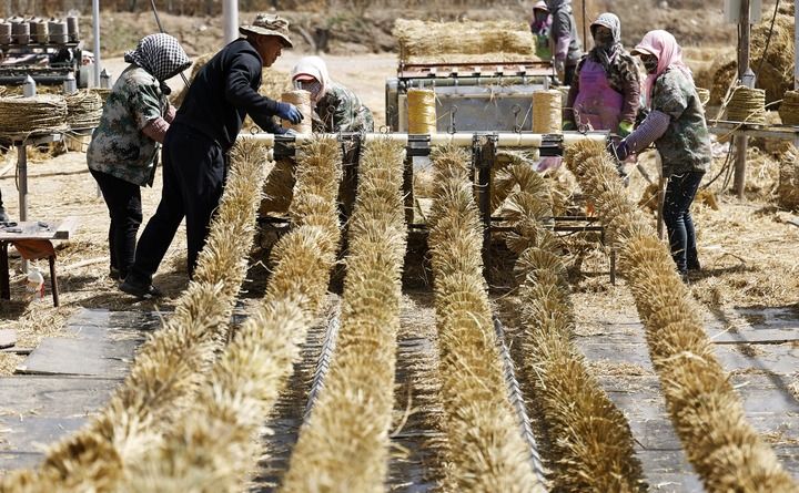 暮春時(shí)節(jié),驅(qū)車行駛在寧夏中衛(wèi)境內(nèi)的騰格里沙漠東南緣,沙脊線上,治沙工人展開一捆捆刷狀草繩縱橫鋪設(shè),仿佛為沙丘披上“格子衫”。