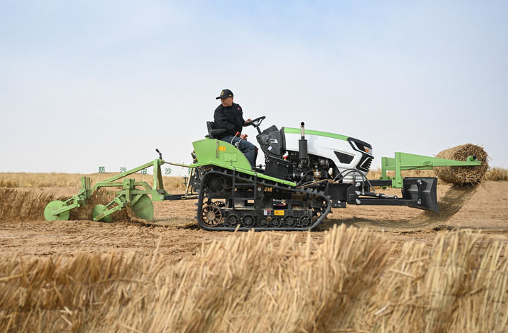 2026年2月28日,工人在內(nèi)蒙古阿拉善盟境內(nèi)的烏蘭布和沙漠駕駛小型履帶沙障機(jī)作業(yè)。新華社記者 貝赫 攝