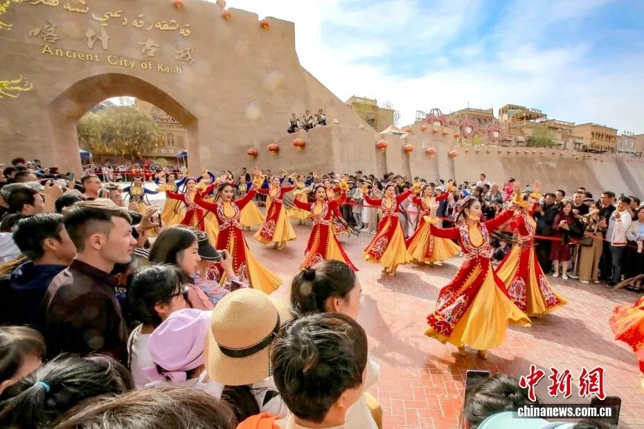 圖為游客在新疆喀什古城景區(qū)觀看歌舞表演。
