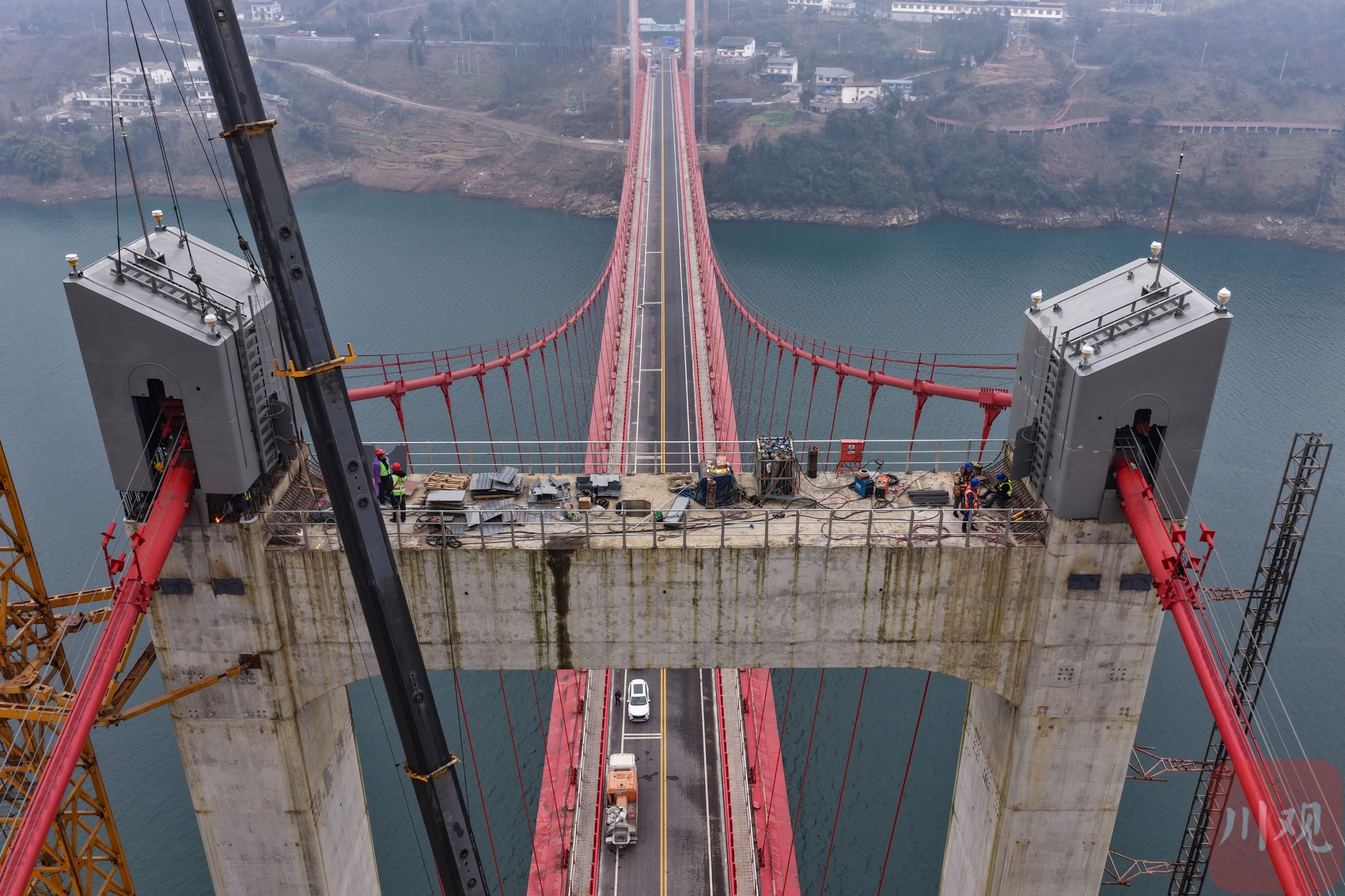 四川阿壩第一座懸索橋主塔塔冠完成安裝