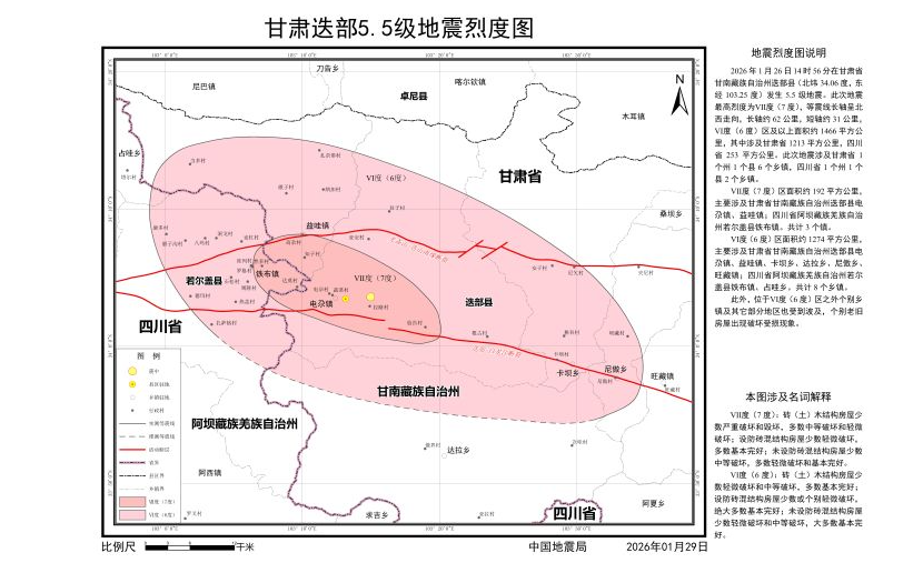2026年1月26日14時56分,在甘肅省甘南州迭部縣發(fā)生5.5級地震。地震發(fā)生后,中國地震局派出地震現(xiàn)場工作隊,依照《地震現(xiàn)場工作:調(diào)查規(guī)范》(GB/T 18208.3-2011)、《中國地震烈度表》(GB/T 17742-2020)、《地震烈度現(xiàn)場評定》(DB/T 107-2025),對災(zāi)區(qū)141個調(diào)查點展開了實地震害調(diào)查,并充分參考震區(qū)斷裂構(gòu)造、儀器烈度、余震分布、震源機制等科技支撐成果,確定了此次地震的烈度分布,完成了《甘肅迭部5.5級地震烈度圖》編制工作,現(xiàn)正式向社會發(fā)布。