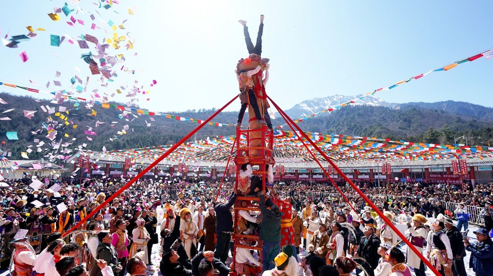 2月25日,農(nóng)歷正月初九,雅安寶興磽磧又迎來(lái)一年一度的上九節(jié)。作為當(dāng)?shù)鼐用衿砀P履?、感恩自然的重要?jié)日,上九節(jié)當(dāng)天,當(dāng)?shù)啬信仙俣贾⒀b走出村寨,敲鑼打鼓結(jié)對(duì)而行?;顒?dòng)包括盛大的祈福、民俗巡游,還有各村村民自己編排的精彩節(jié)目。
