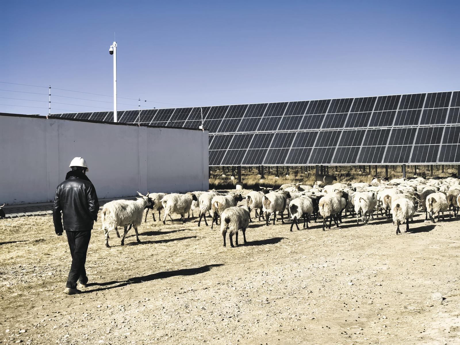 牧民索南才讓家的羊群,在光伏板下覓食。