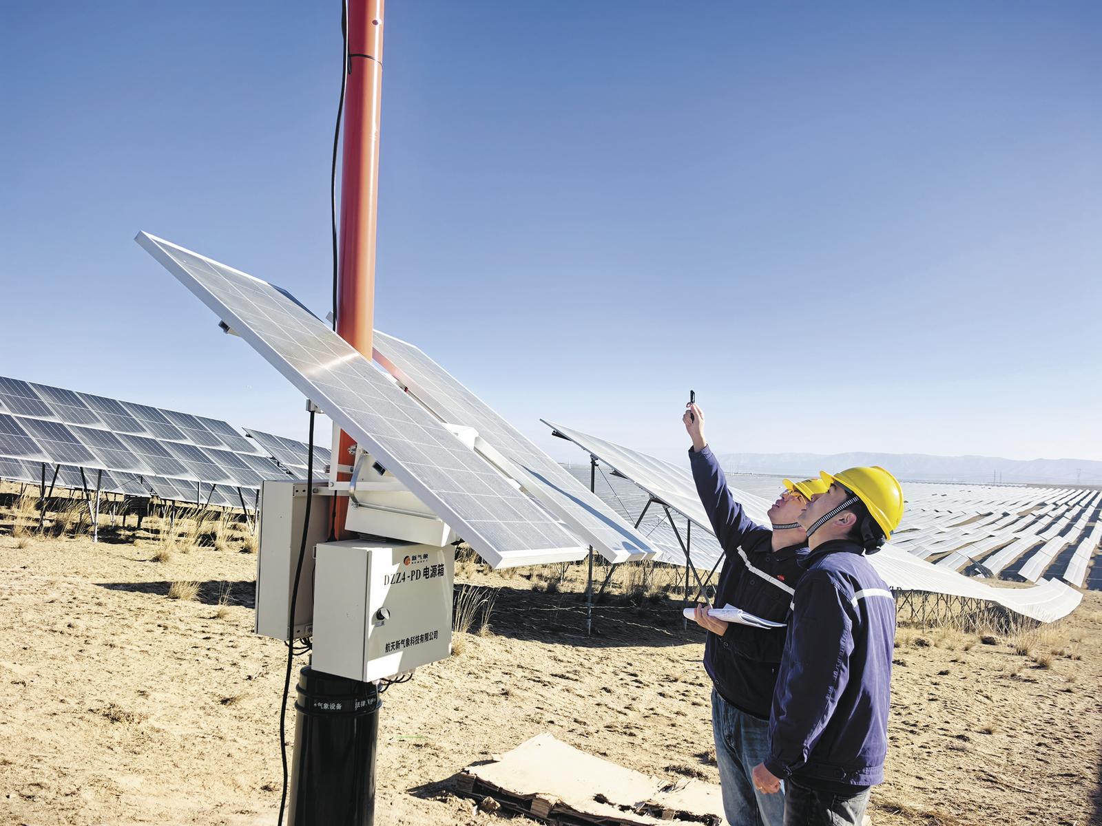 國(guó)能共和光伏電站氣象站內(nèi),工作人員開(kāi)展巡檢工作。