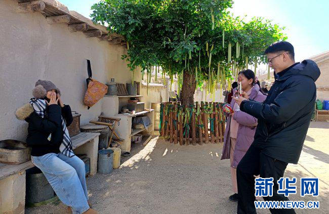 游客在柯魯柯鎮(zhèn)沉浸式影視文旅基地內(nèi)參觀體驗。新華網(wǎng) 蔡得軍 攝