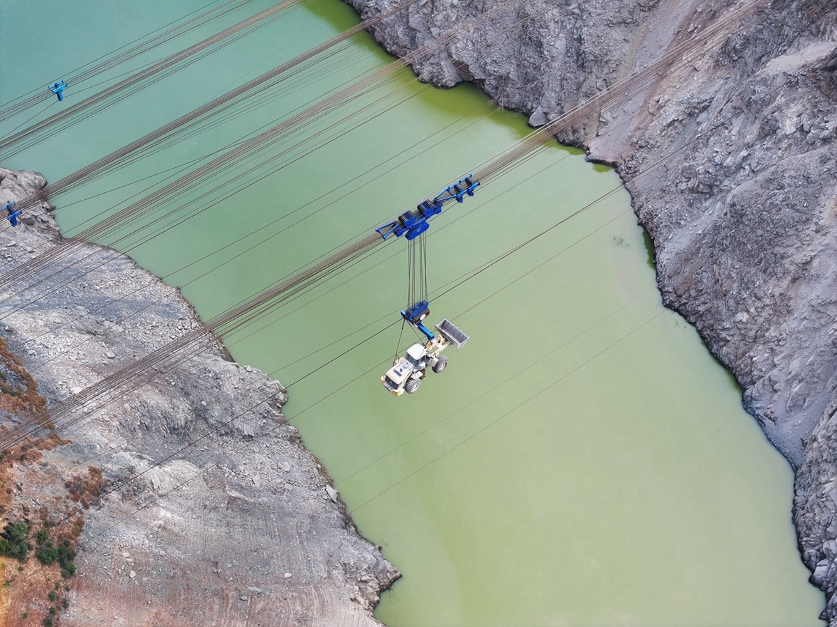 3噸臨時索道——“微力先行”。早在2023年8月,理塘河特大橋就已搭建起3噸臨時索道,作為施工前期的“物資擺渡車”,承擔基礎物料運輸任務,將鉆機、鋼筋、水泥、小型機具等零散物資精準運抵木里岸,有效解決了“無路可通”的初始難題。