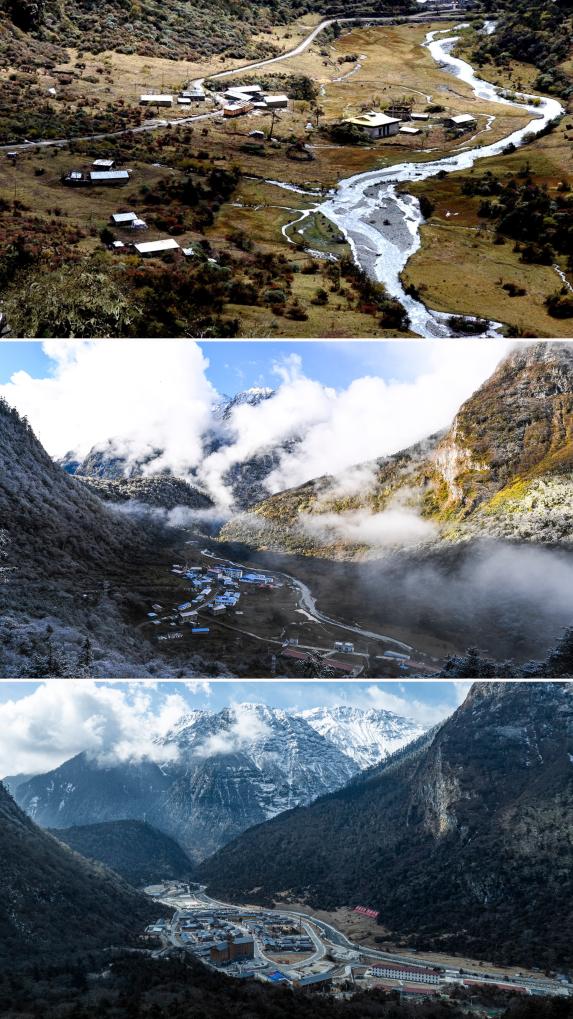 拼版照片:上圖是2003年10月26日拍攝的玉麥鄉(xiāng)(新華社記者索朗羅布攝);中圖是2017年10月31日拍攝的玉麥鄉(xiāng)(新華社記者普布扎西攝);下圖是2026年2月5日拍攝的玉麥鄉(xiāng)(無(wú)人機(jī)照片,新華社記者丁增尼達(dá)攝)。