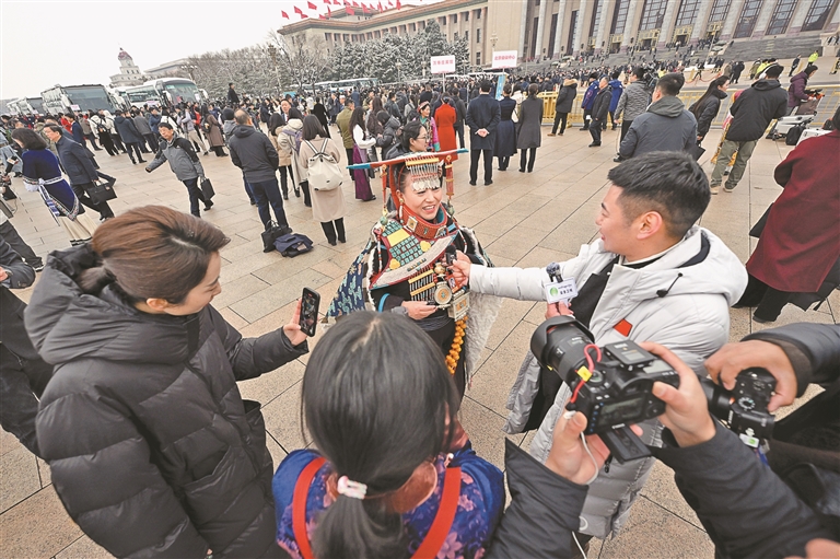 走出人民大會堂后,代表們?nèi)栽跓崃矣懻摗?/p>