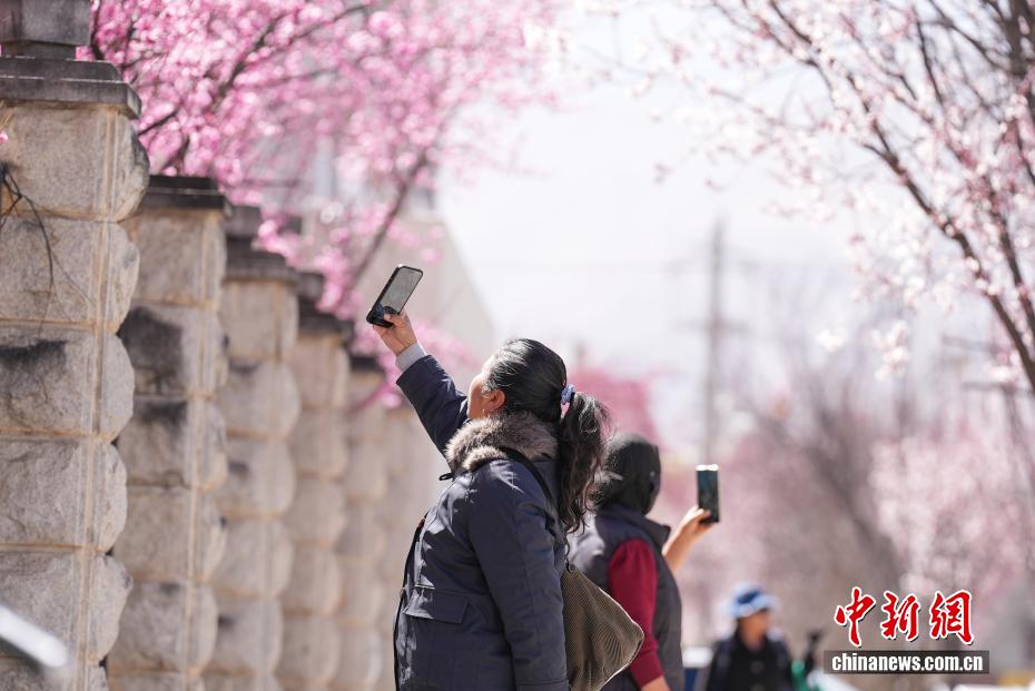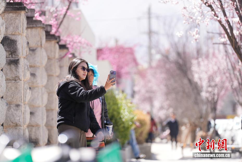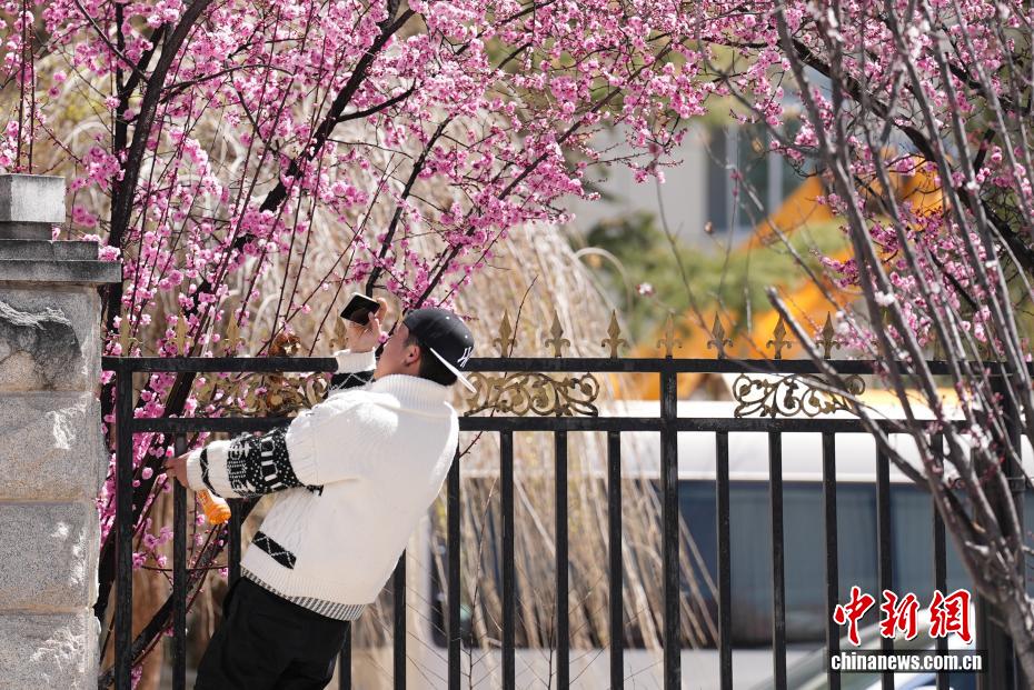 3月18日,隨著雪域高原天氣回暖,西藏拉薩市區(qū)道路旁春花綻放。拉薩城關(guān)區(qū)軍民路兩側(cè),花朵盛開,吸引不少市民和游客前來(lái)拍照留念。一時(shí)間,軍民路成了拉薩今春熱門打卡地,人們穿梭其中,感受春日的美好。圖為游客在春花綻放的道路旁賞花。貢確 攝