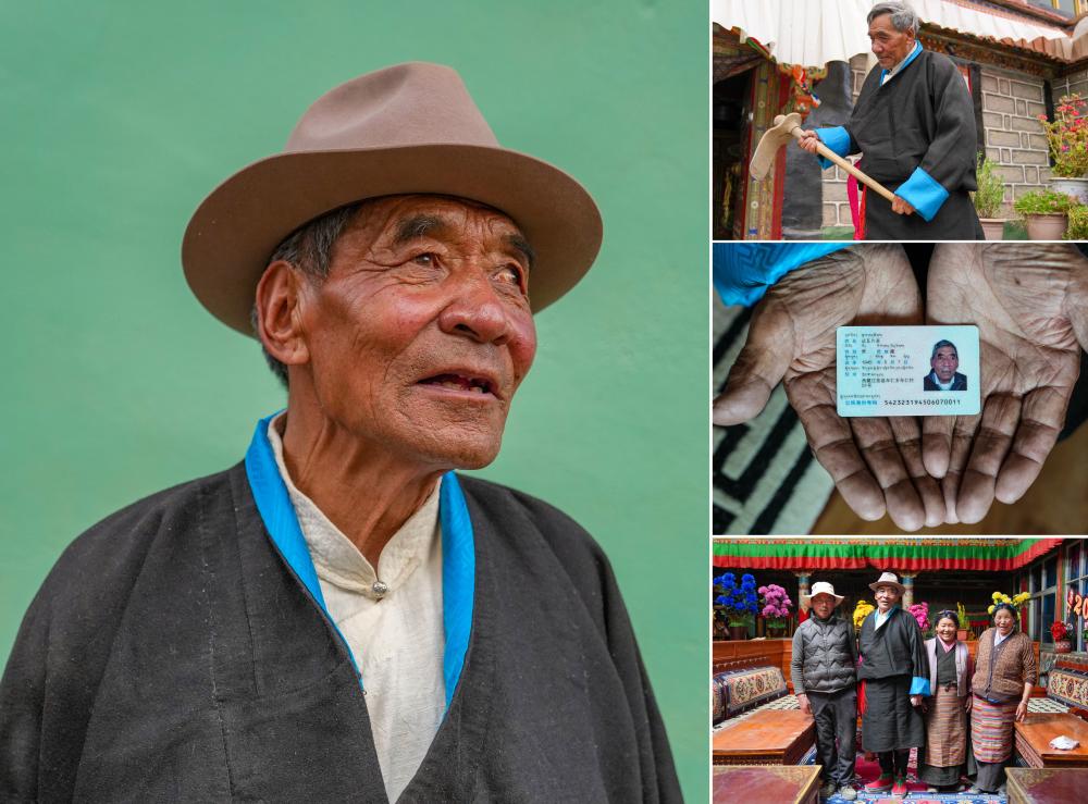 拼版照片:(左)達(dá)瓦片多的肖像(3月12日攝);(右上)達(dá)瓦片多展示當(dāng)農(nóng)奴時使用過的農(nóng)具(3月12日攝);(右中)達(dá)瓦片多的身份證(3月12日攝);(右下) 達(dá)瓦片多(左二)和家人在家中合影(3月12日攝)。