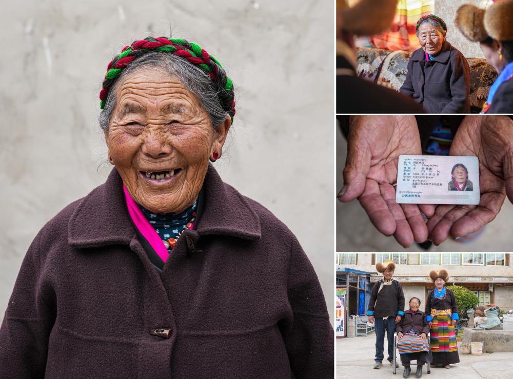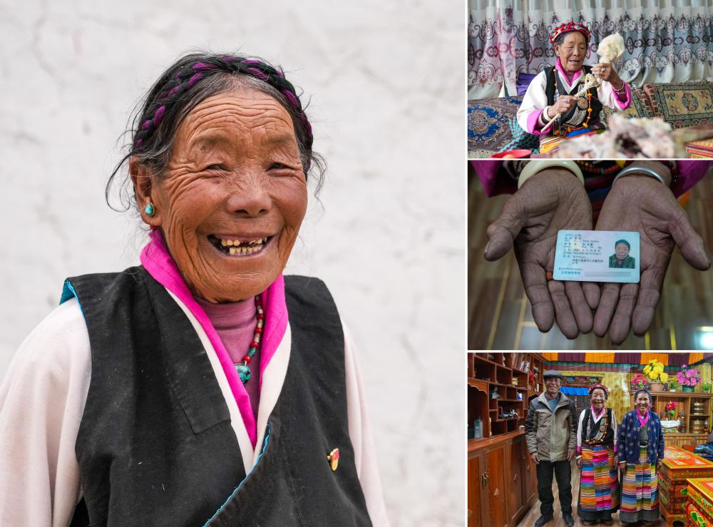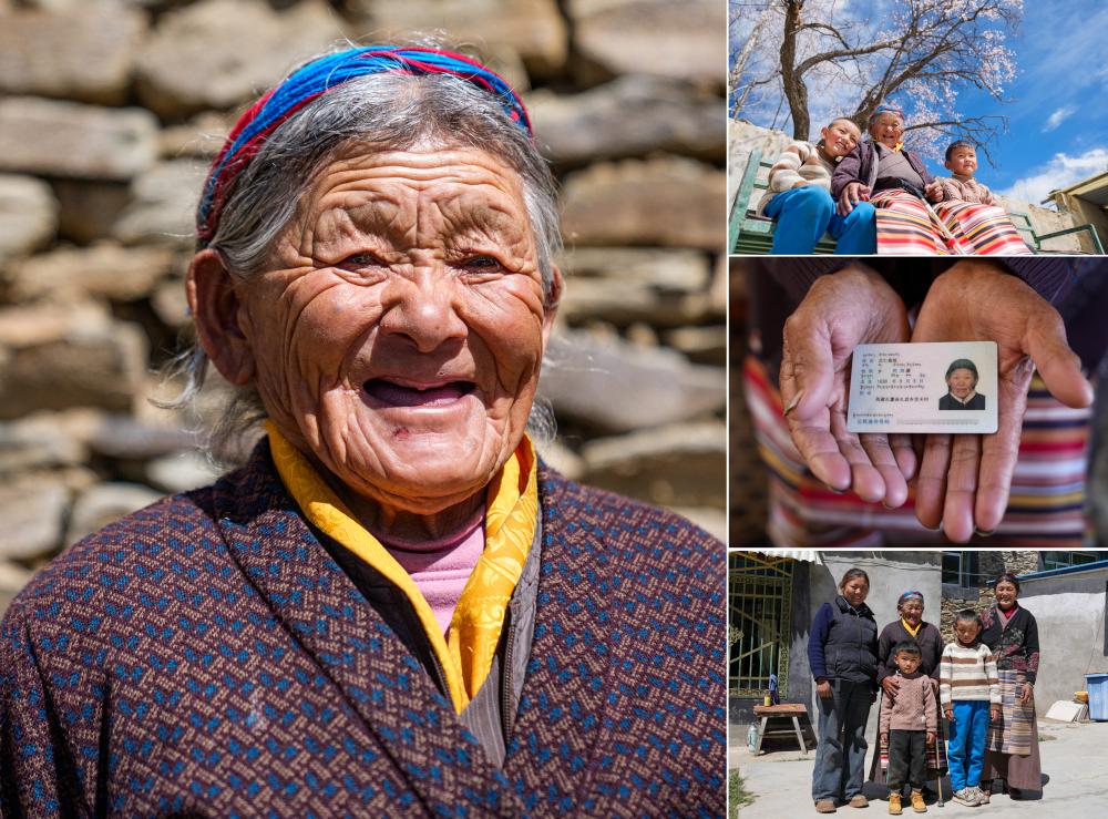 拼版照片:(左)次仁桑姆的肖像(3月26日攝);(右上)次仁桑姆(中)和兩位晚輩在宗卡村家中的院子里聊天(3月26日攝);(右中)次仁桑姆的身份證(3月26日攝);(右下)次仁桑姆(后左2)和家人在宗卡村家中合影(3月26日攝)。
