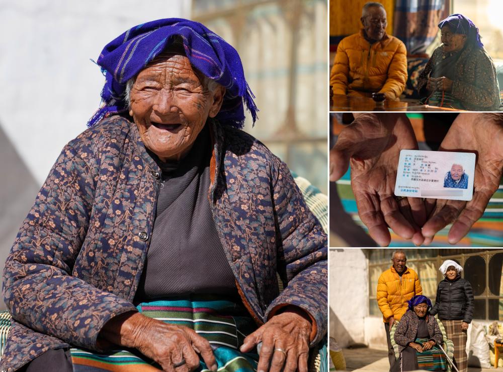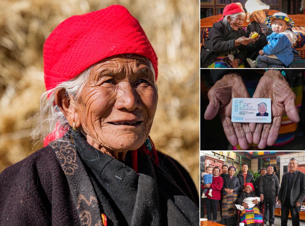 拼版照片:(左)嘎多的肖像(3月25日攝);(右上)嘎多(左)在山南市乃東區(qū)昌珠鎮(zhèn)卡多村的家里和兒媳逗曾孫玩(3月25日攝);(右中)嘎多的身份證(3月25日攝);(右下)嘎多(中)在山南市乃東區(qū)昌珠鎮(zhèn)卡多村的家里和家人合影(3月25日攝)。