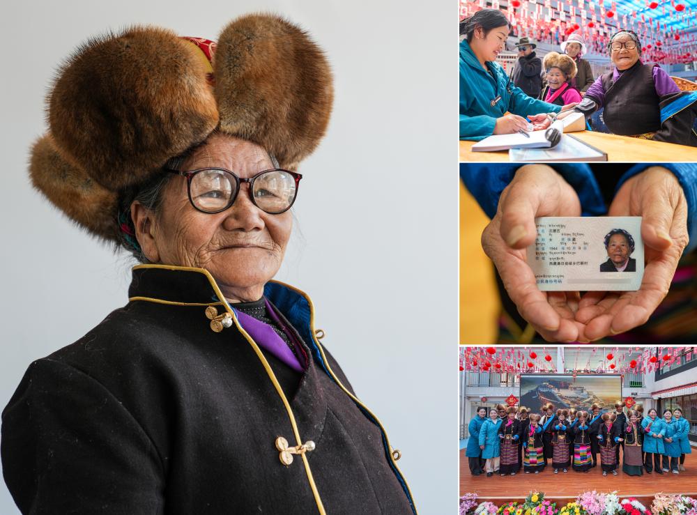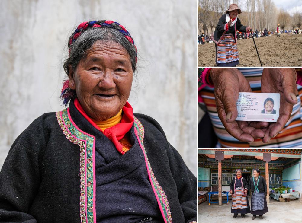 拼版照片:(左)卓瑪吾珠的肖像(3月16日攝);(右上)卓瑪吾珠在慶祝春耕儀式上(3月16日攝);(右中)卓瑪吾珠的身份證(3月16日攝);(右下)卓瑪吾珠(左)和女兒在家中的合影(3月16日攝)。