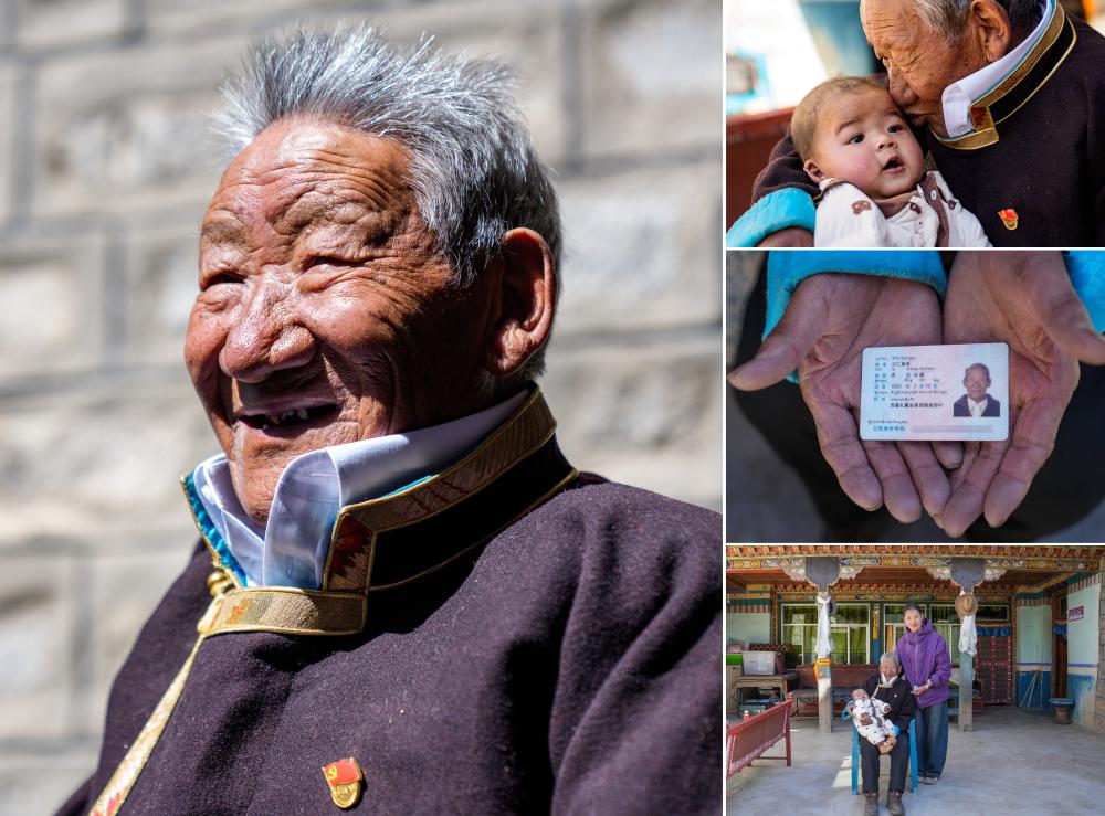 拼版照片:(左)次仁桑珠的肖像(3月25日攝);(右上)次仁桑珠在西藏山南市扎囊縣桑耶鎮(zhèn)的家中親吻曾孫(3月25日攝);(右中)次仁桑珠的身份證(3月25日攝);(右下)次仁桑珠(中)和孫女、曾孫在西藏山南市扎囊縣桑耶鎮(zhèn)家中的合影(3月25日攝)。
