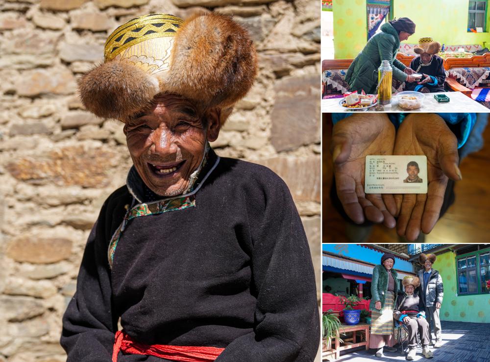 拼版照片:(左)次德吉的肖像(3月25日攝);(右上)次德吉在山南市桑日縣特困人員集中供養(yǎng)中心測量血壓(3月25日攝);(右中)次德吉的身份證(3月25日攝);(右下)次德吉(前排右七)和部分山南市桑日縣特困人員集中供養(yǎng)中心老人合影(3月25日攝)。