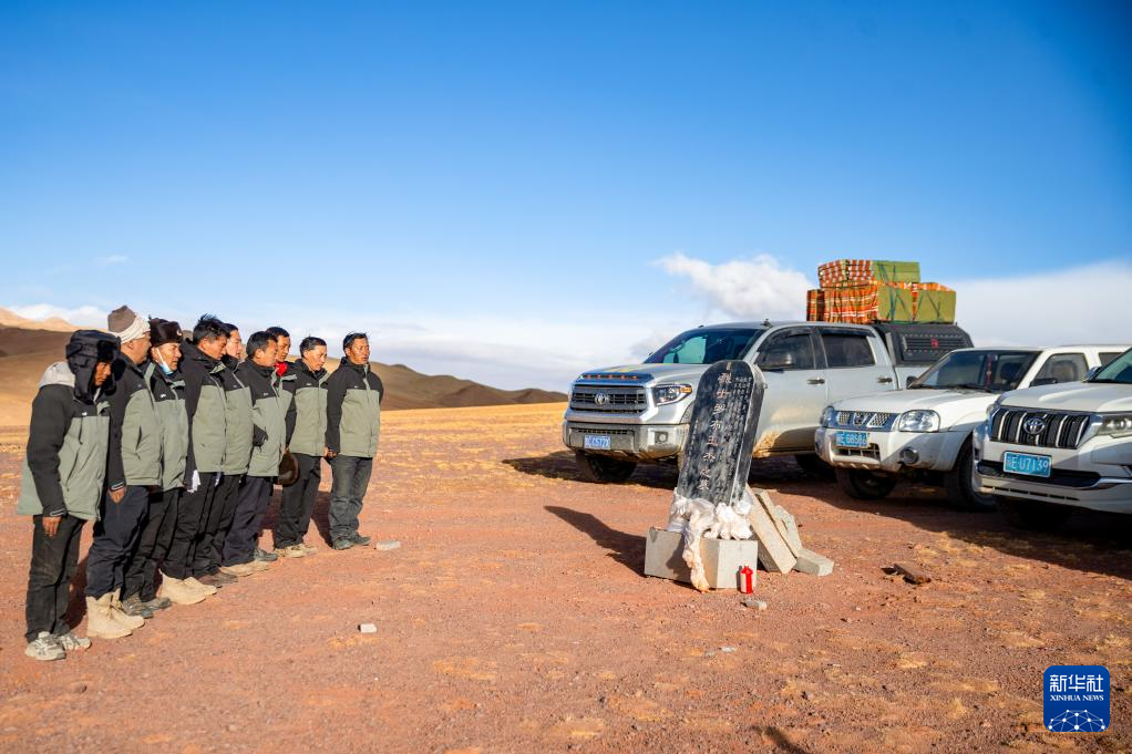 4月8日,即將進入“無人區(qū)”進行巡護的羌塘國家級自然保護區(qū)那曲地區(qū)管理局野生動物專業(yè)管護員們按慣例在羅布玉杰烈士墓前默哀致敬。羅布玉杰2002年在與盜獵分子的槍戰(zhàn)中犧牲。新華社記者 姜帆 攝