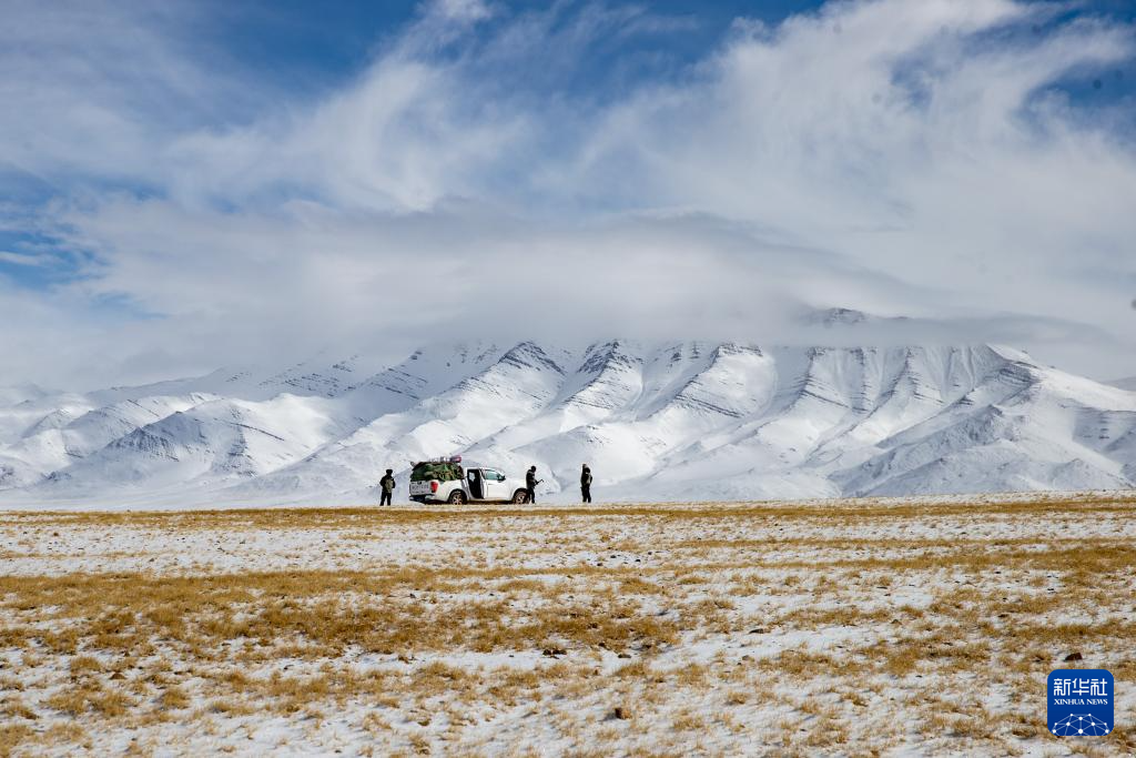 4月9日,羌塘國家級自然保護區(qū)那曲地區(qū)管理局野生動物專業(yè)管護員們在雪山前觀察地勢。新華社記者 姜帆 攝
