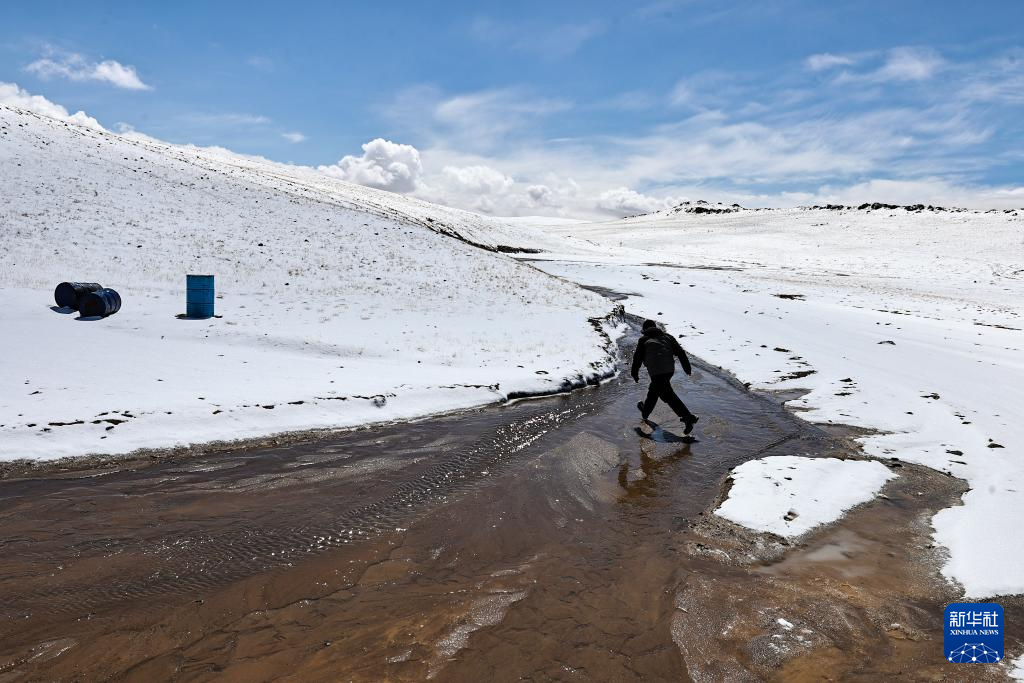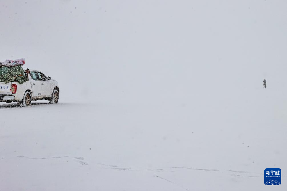 4月9日,在巡護途中遇到暴雪,羌塘國家級自然保護區(qū)那曲地區(qū)管理局野生動物專業(yè)管護員格桑倫珠徒步為車隊勘察安全線路。新華社記者 姜帆 攝