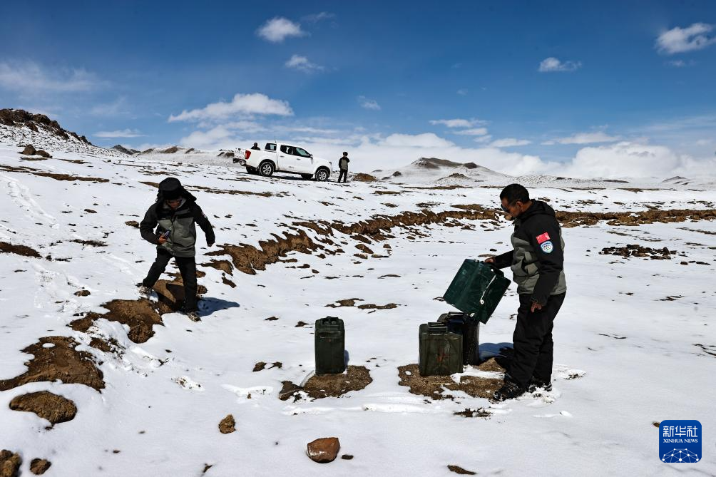 4月10日,羌塘國家級自然保護區(qū)那曲地區(qū)管理局野生動物專業(yè)管護員羅布(右)和格桑加措在“巴毛窮宗”地區(qū)查看非法穿越者遺棄的油桶。新華社記者 姜帆 攝