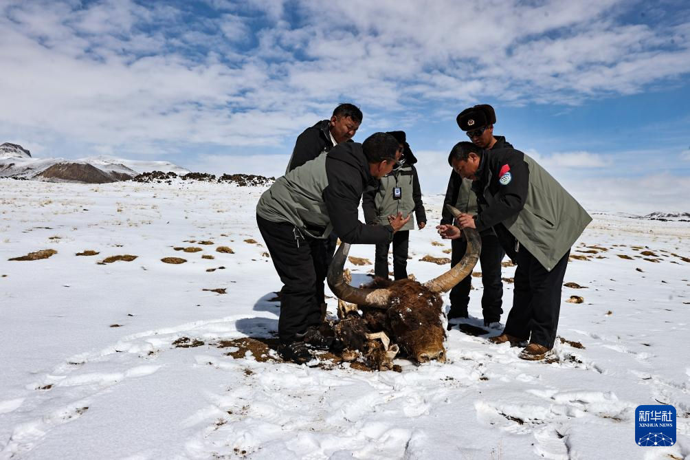 4月10日,羌塘國家級自然保護區(qū)那曲地區(qū)管理局野生動物專業(yè)管護員們在“巴毛窮宗”地區(qū)測量一頭異常龐大的野牦牛遺骸。新華社記者 姜帆 攝