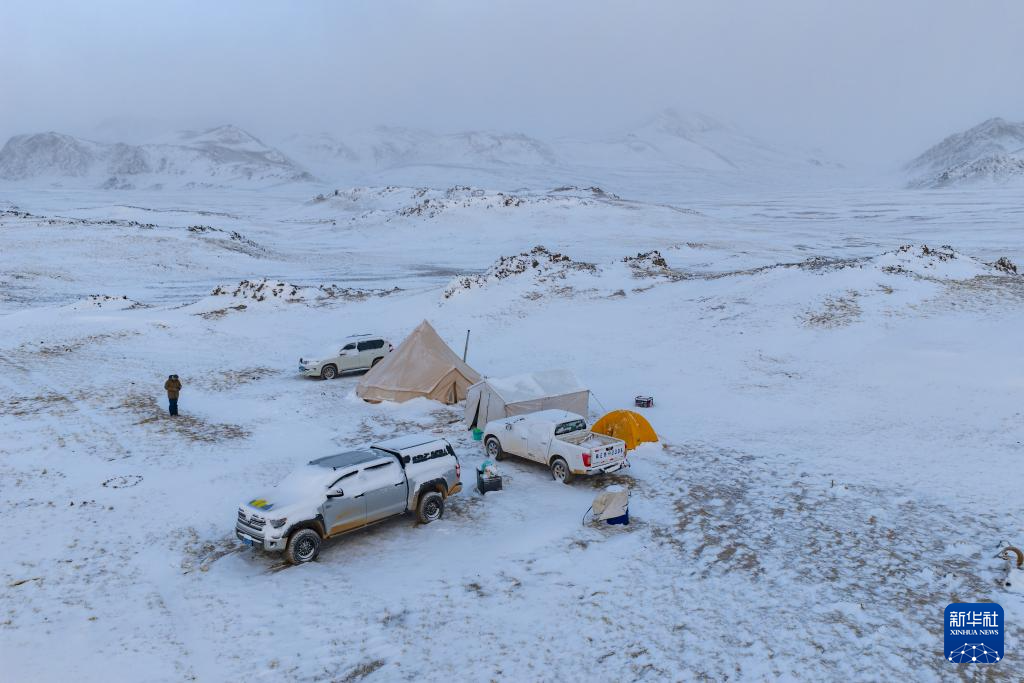4月11日,羌塘國家級自然保護區(qū)那曲地區(qū)管理局的巡護隊伍在“巴毛窮宗”地區(qū)雪中宿營(無人機照片)。新華社記者 姜帆 攝