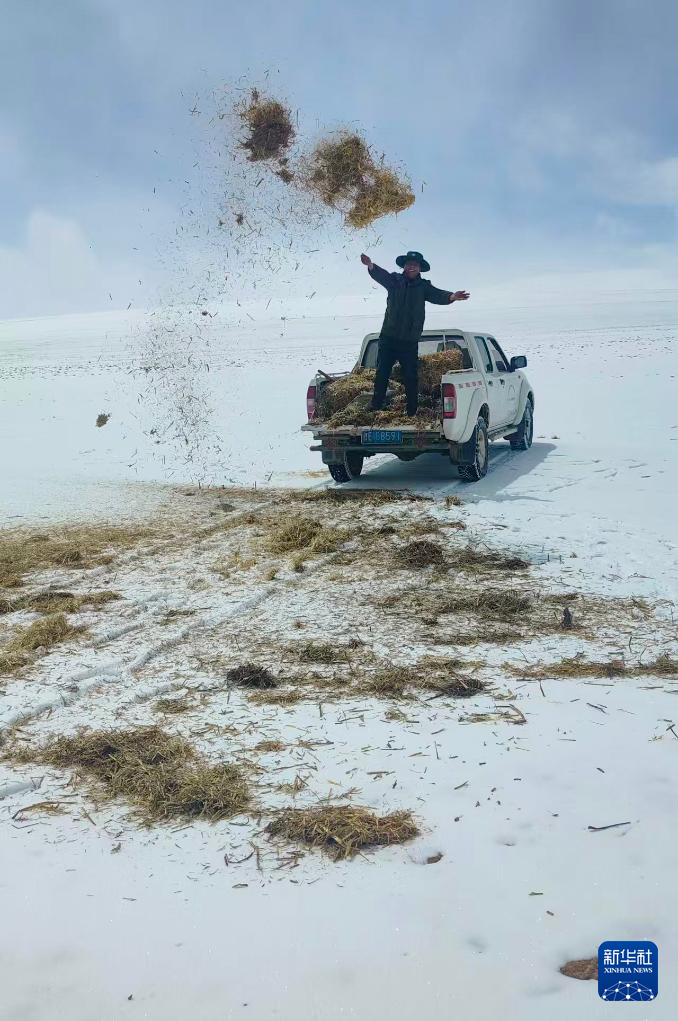 4月13日,羌塘國家級自然保護區(qū)那曲地區(qū)管理局野生動物專業(yè)管護員在藏羚羊、野牦牛的出沒區(qū)域拋撒草料(手機照片)。新華社發(fā)