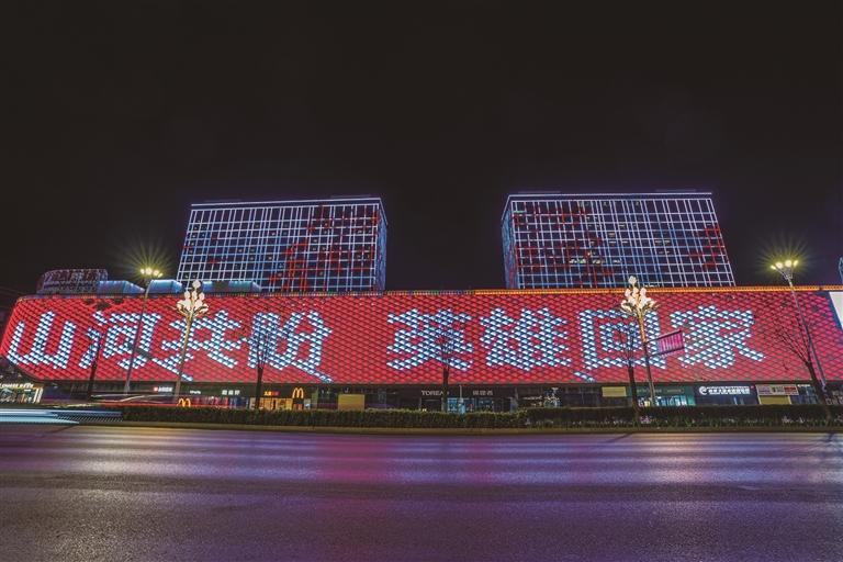柳梧萬達(dá)大屏顯示“山河共盼 英雄回家”字幕。