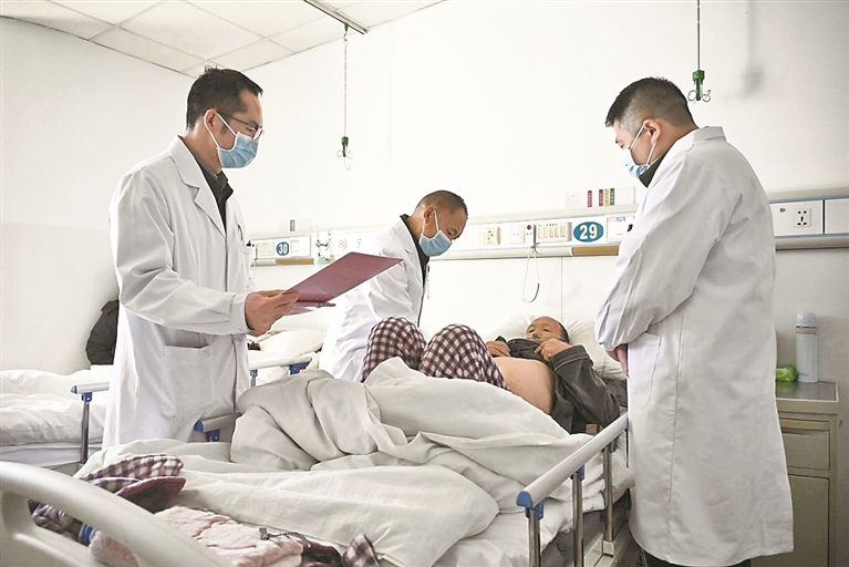 圖為西藏軍區(qū)總醫(yī)院普通外科專家團隊在查房,普布次仁醫(yī)生(左二)對患者進行腹部檢查。通訊員 西培多杰 攝