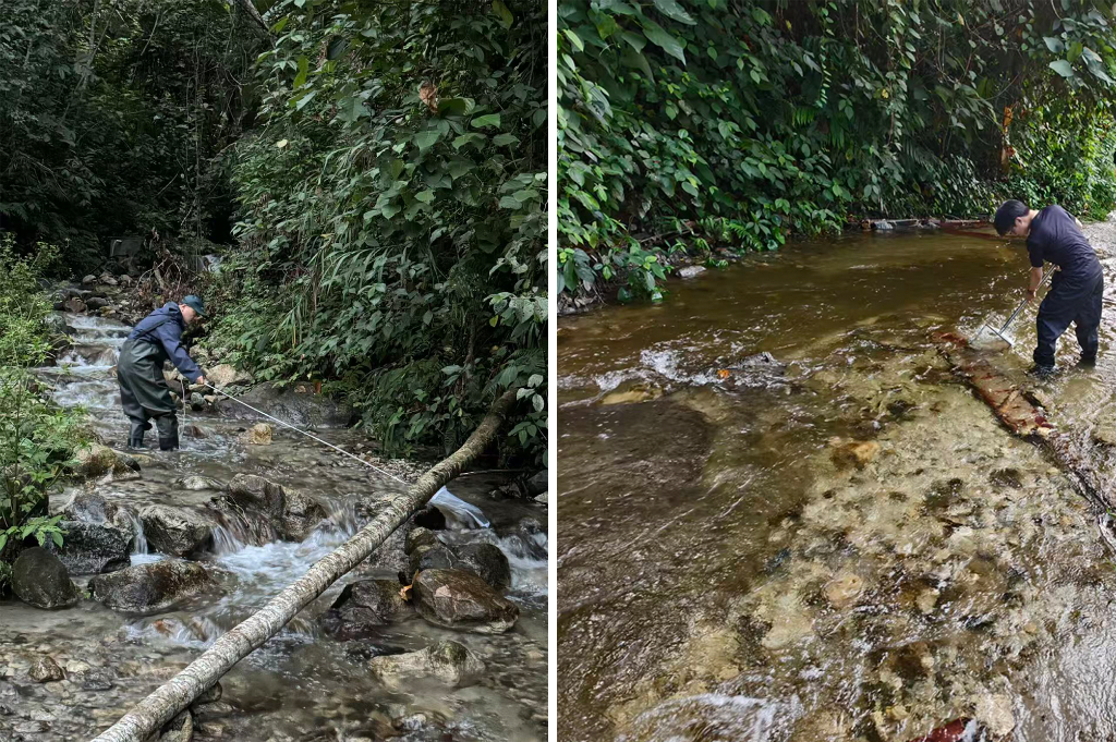 圖為墨脫流施密搖蚊棲息地環(huán)境照。上海海洋大學林曉龍副教授(左)和碩士研究生張智超(右)正在采集水生昆蟲。(西藏自治區(qū)高原生物研究所“達娃創(chuàng)新工作室”供圖)