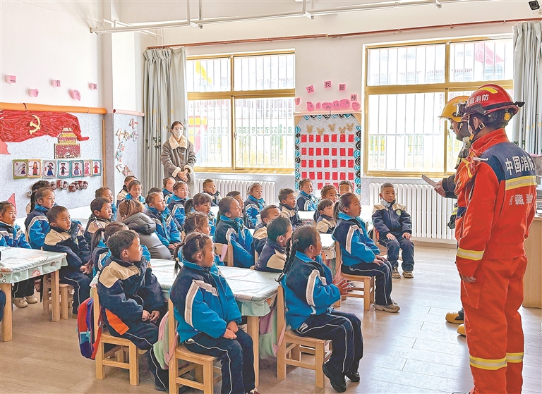 圖為消防員向?qū)W生講解消防知識。記者 索朗旺久 通訊員 高貴地 攝